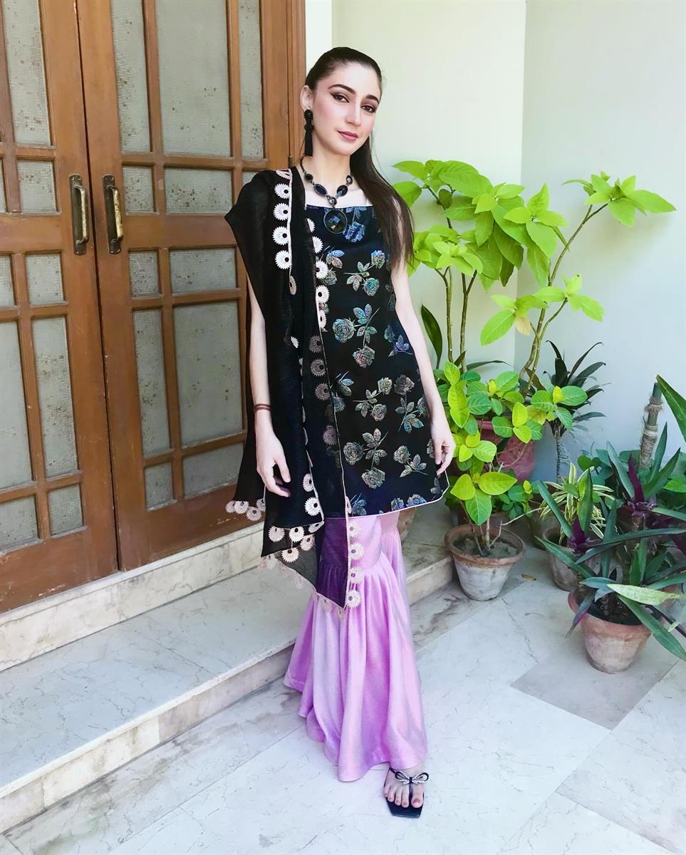 A pretty outfit on a pretty girl! Black velvet silk with iridescent rose-print, matched with iridescent pink, velvet-silk palazzos!