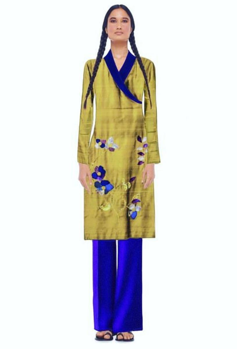 Incorporate homegrown and handwoven into your upcoming festive closet. Choose this olive Rawsilk long tunic top, with a contrasting Royal Blue velours wrapped-collar and sparkling contemporary embellishments, and pair it with ink-blue palazzos to make a ‘Champion’ style statement!